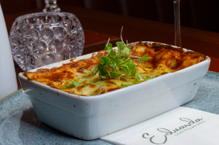 Saborosa fatia com 8 camadas de lasanha, preparada com carne desfiada, molho bechamel, parmesão e mozarella, grelhada e finalizada com molho demi glacê, fonduta de queijo, toque de salsa de trufa e azeite por cima.