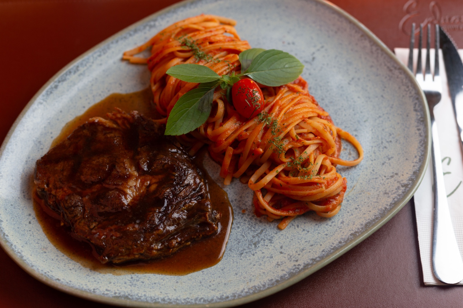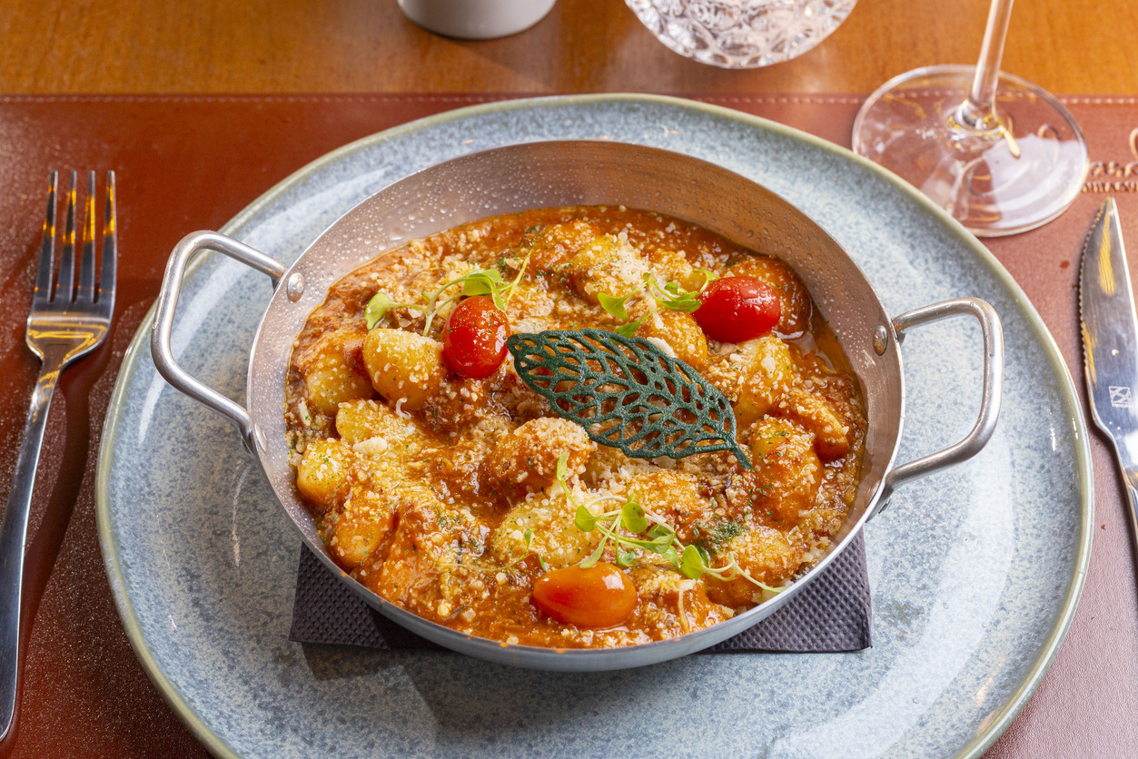 Corte chorizo (250g) assado no carvão, gnocchi de batata artesanal, puxado em molho (escolha 1 opção: pomodoro ou fonduta de queijo) finalizado com molho demi glacê (molho de carne)