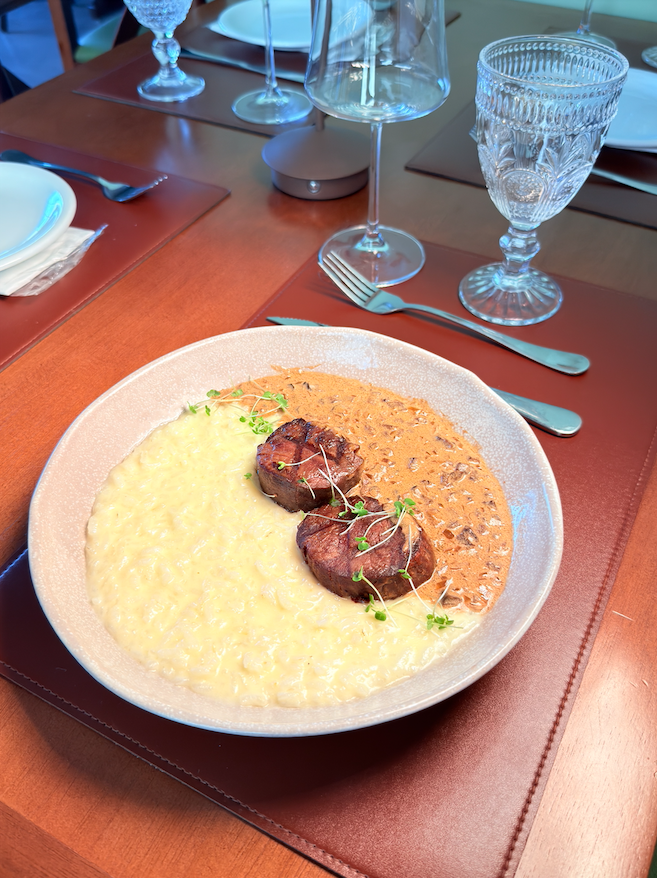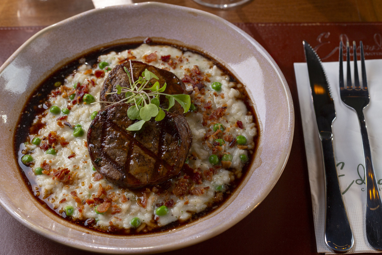 Um cremoso e saboroso ristoto de gorgonzola. Acompanha tornedor de mignon assado e molho Demi glacê.