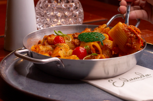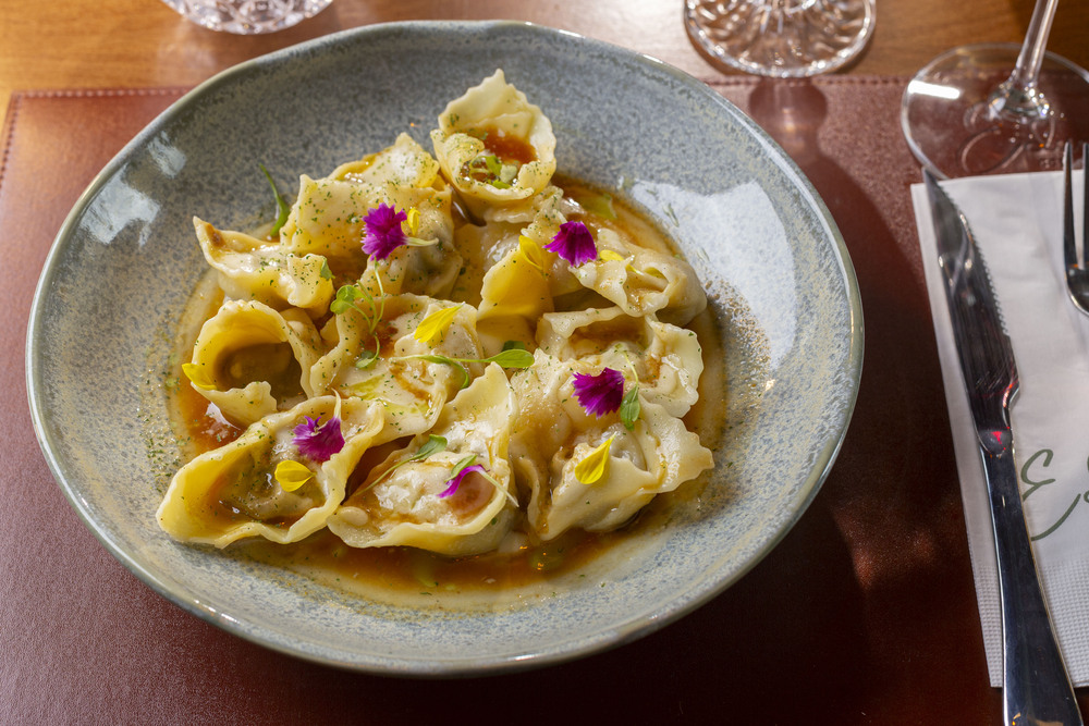 Tortelli feito na casa artesanalmente, recheado de fraudinha desfiada, puxada na manteiga, servida em molho de queijo e saboroso demi glacé e azeite de ervas.
