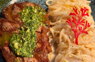 Massa longa grano duro puxada em manteiga de ervas, acompanha Tornedor de mignon ao molho poivre vert (molho