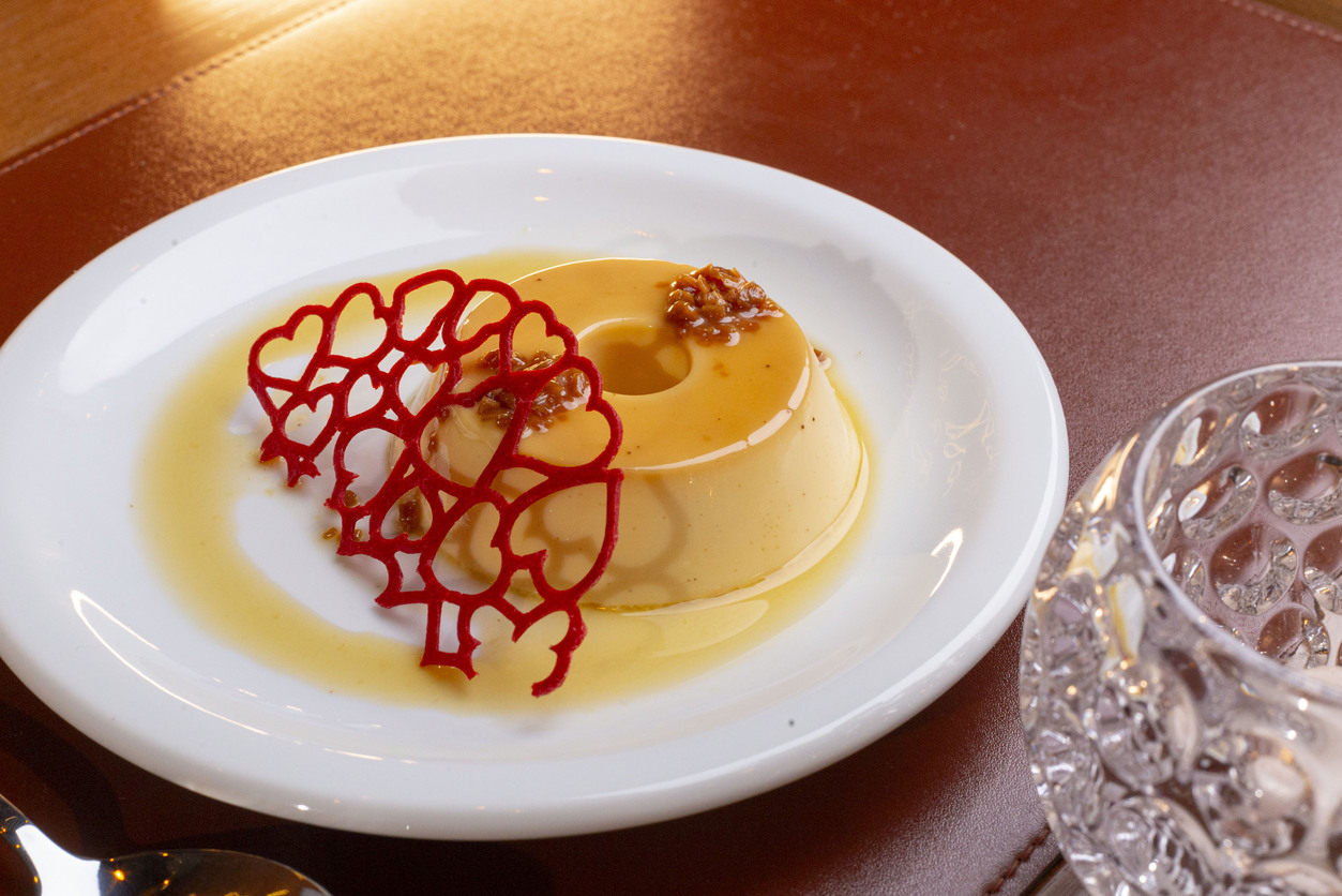 Pudim de leite condensado com toque de baunilha, calda de caramelo, finalizado com praliné de caramelo salgado e tuile.