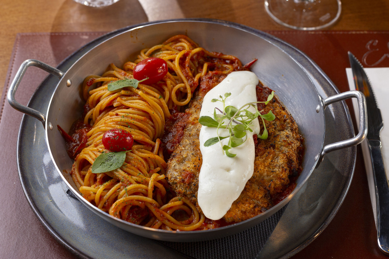 Um suculento bife de mignon a milanesa com crosta perfeita, e assado, (nosso milanesa não é frito), coberto com molho pomodoro da casa, parmesão e creme de Burrata e maçaricado. Acompanha massa longa grano duro com molho (escolha 1 opção: molho pomodoro, bechamel, molho bechamel com limão siciliano)