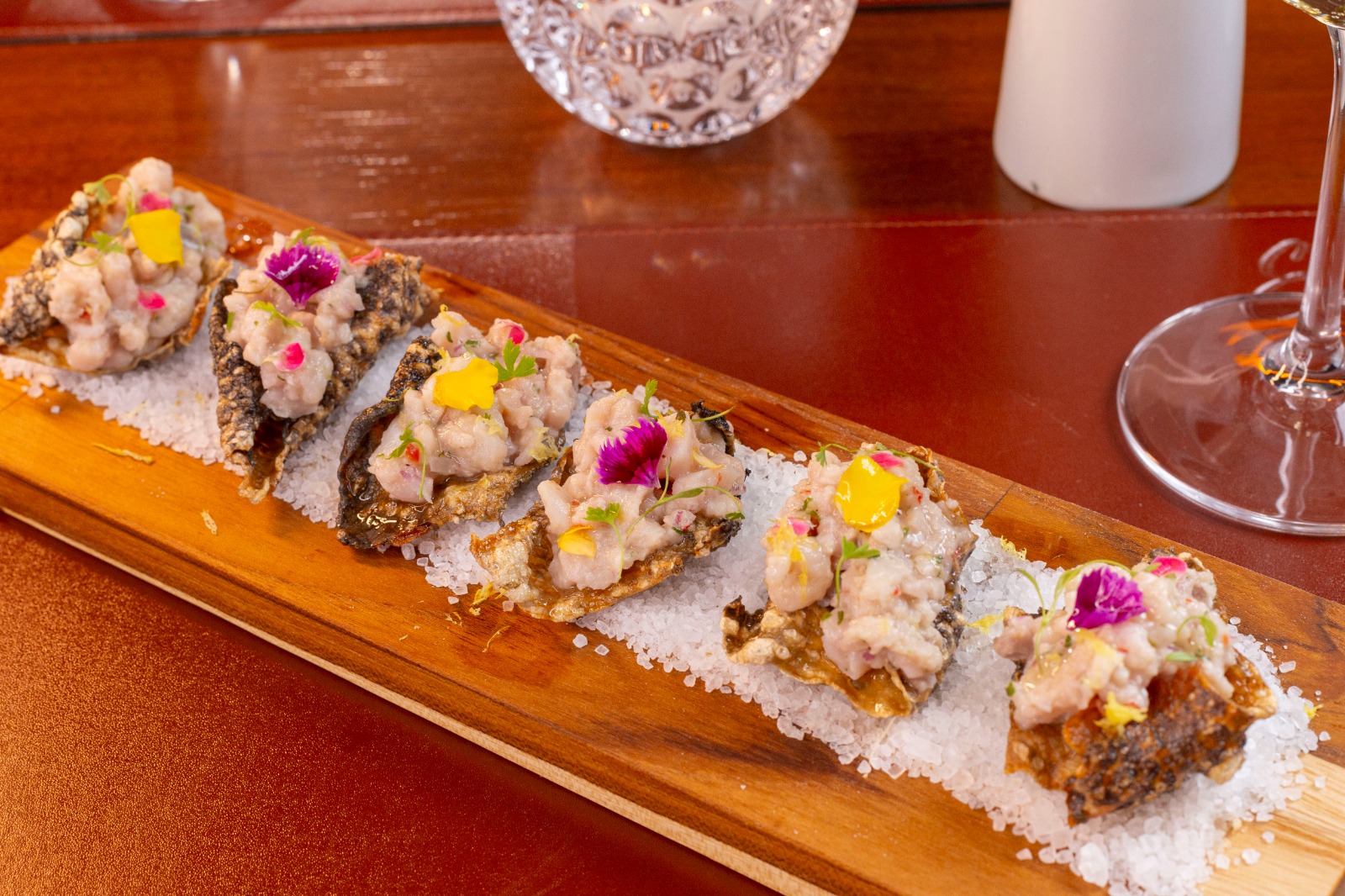 Tartar de tilápia ao modo da chef Cris, cebola roxa, leite de tigre, pimenta dedo de moça, toque de limão preparado em pururuca de tilápia (6 unidades).