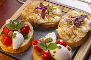 Preparadas com fatias de pão de fermentação natural. Caprese (02 unid): Tomatinhos confit, pesto e mozzarella de búfala. Brie com mel e nozes (02 unid).