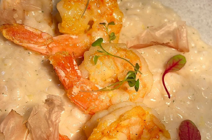 Risoto de camarão, redução de limão siciliano, finalizado com 3 camarões G e um toque de katsuobushi ( peixe ralado).
