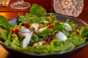 Mix de folhas, tomatinhos confitados, muçarela de bufala, molho pesto de manjericão, toque de creme de aceto balsâmico.