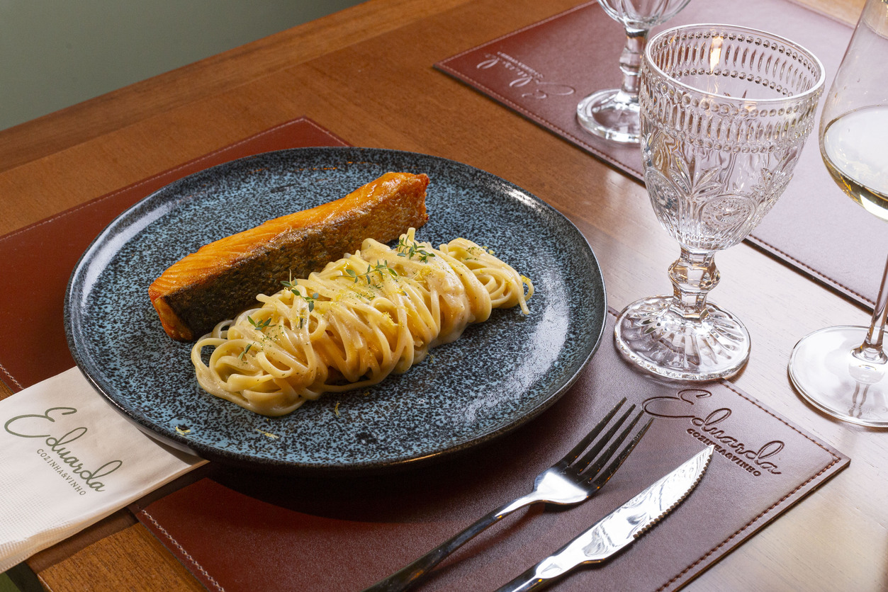 Linguine grano duro ( escolha 1 opção: molho pomodoro, bechamel ou bechamel com limão siciliano). Acompanhada de posta de salmon ( 200g ) grelhado