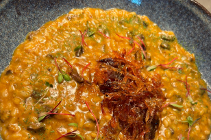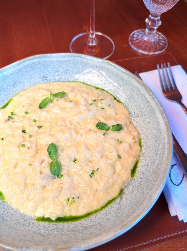 Risoto de brie, parmesão e manteiga, finalizado com crispy de Parma.