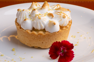 Massa crocante e amanteigada, Creme de chocolate branco com limão, finalizado com merengue maçaricado e raspas de limão.
