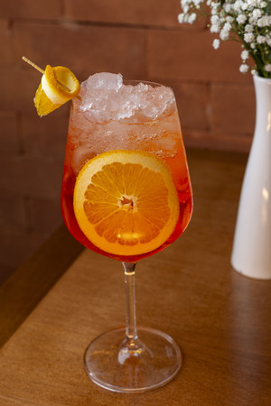 Aperol, água com gás e espumante brut, rodelas de laranja.