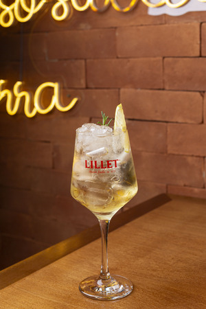 Lillet, espumante brut, água com gás, limão siciliano e alecrim