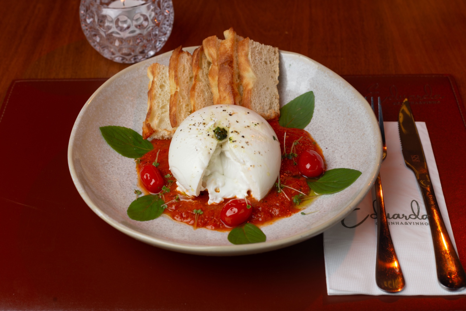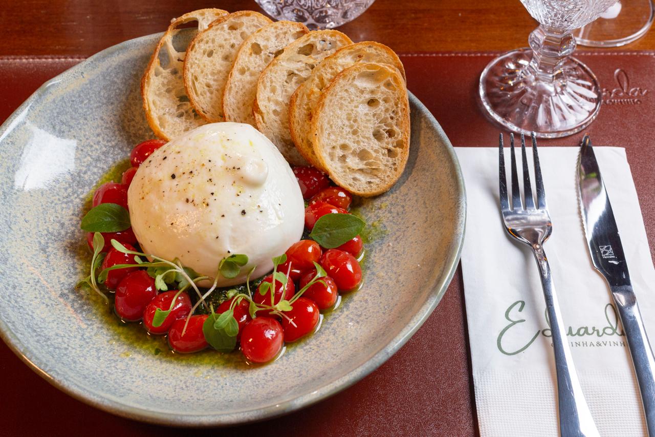 Burrata, molho romesco, tomatinhos confitados, toque de pesto,