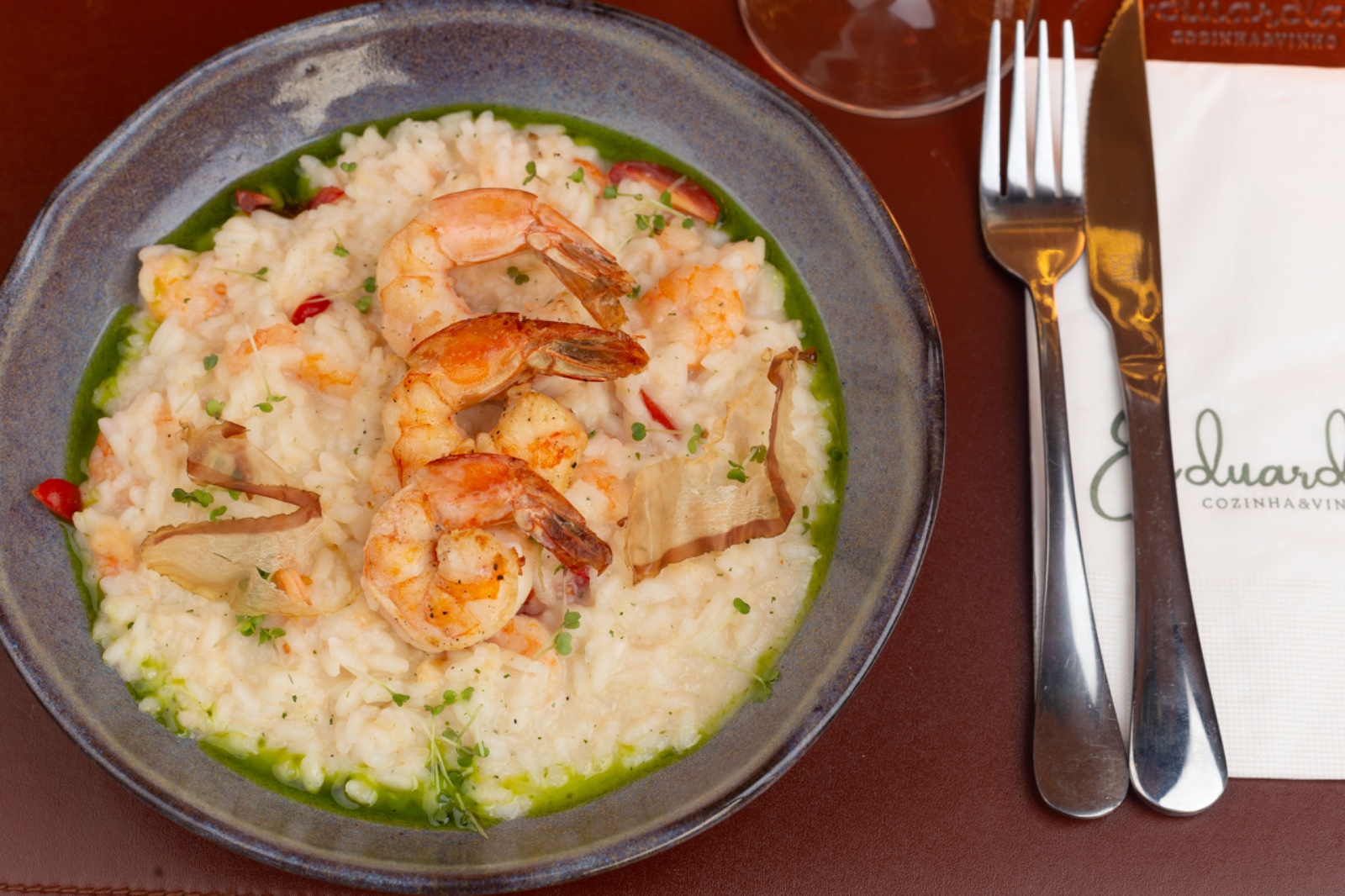 Um risoto refrescante e saboroso de limão siciliano, camarão sete barbas, finalizado com camarões G, azeite verde e toque de katsuabushi.