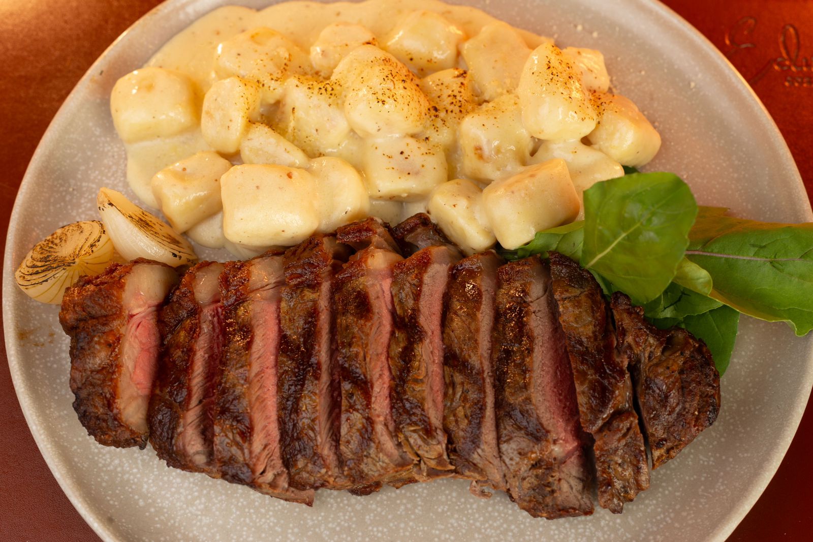 Tagliata de steak chorizo angus (250g) grelhado, servido com nhoque de batata da casa, envolvido ao molho de pimenta verde.