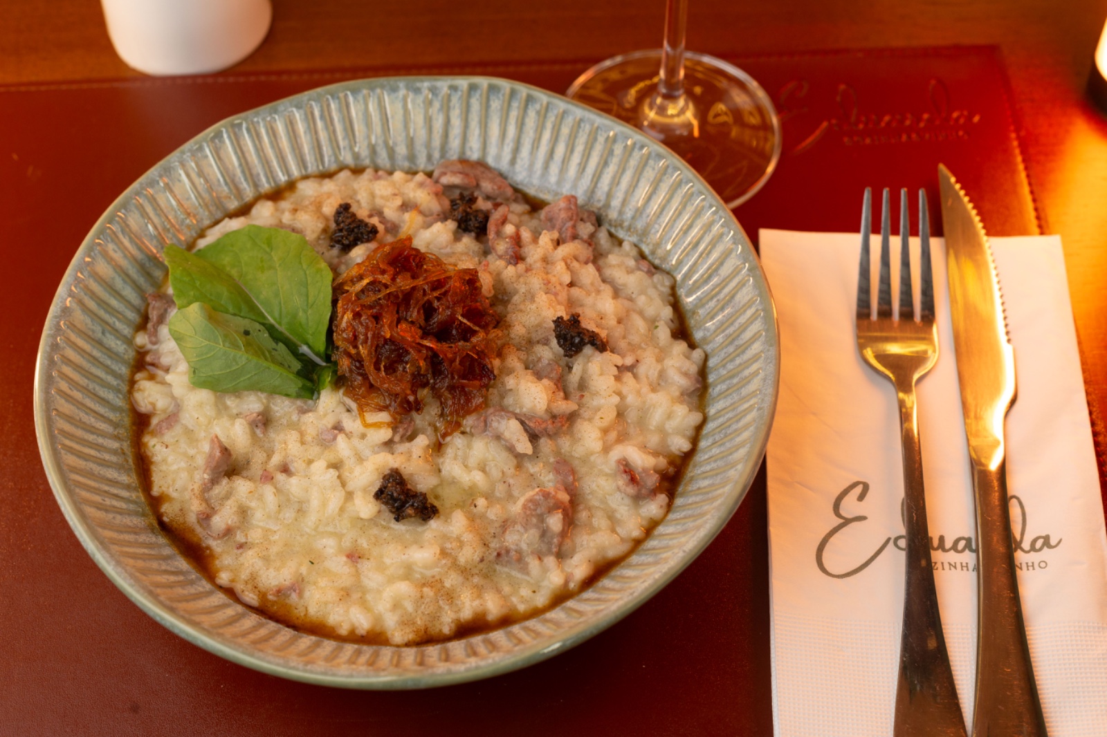 Um saboroso risoto com iscas de mignon, parmesão e manteiga, toque de salsa trufada, finalizado com cebola caramelizada.