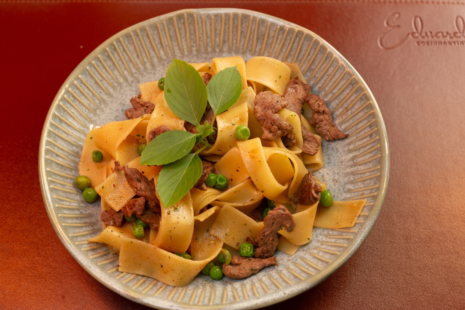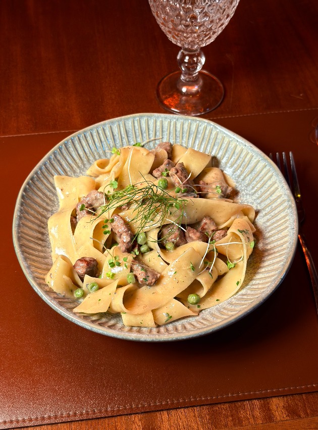 Papardelle, puxado em molho demi glace, iscas de filé mignon, ervilhas frescas.
