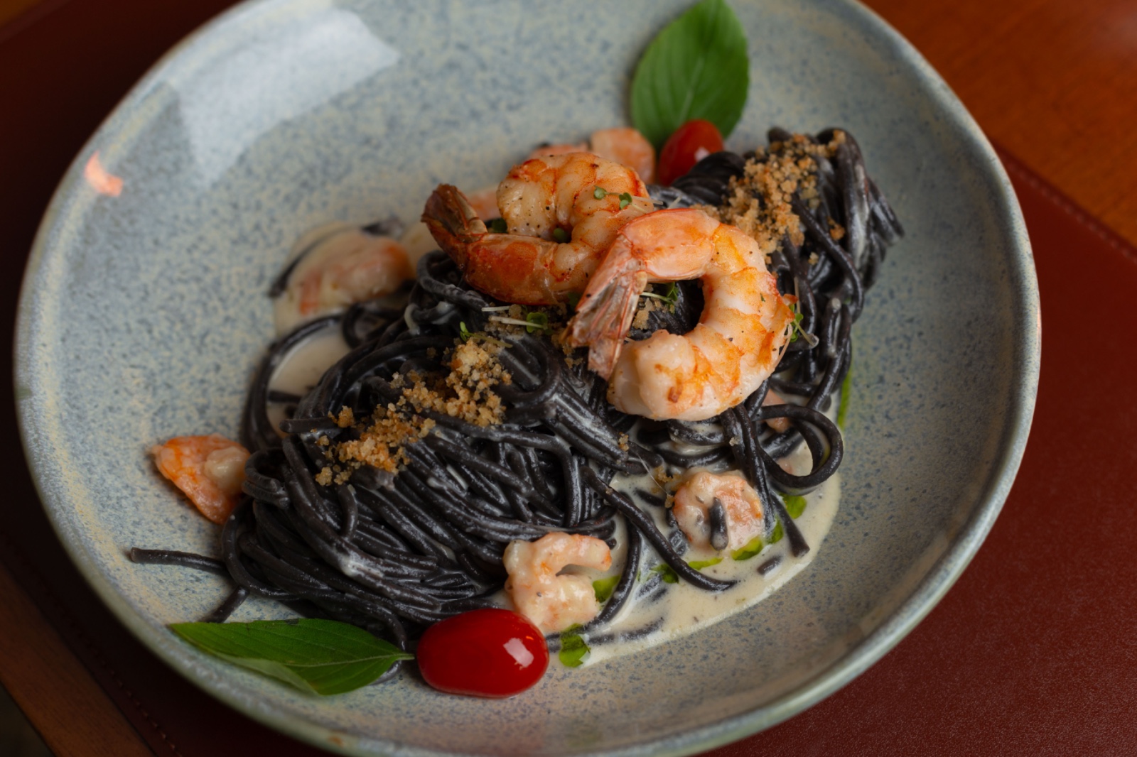 Massa spaguetti Nero (massa negra), molho de vinho (base de nata e vinho), camarão sete barbas e finalizado com 2 camarões rosa.