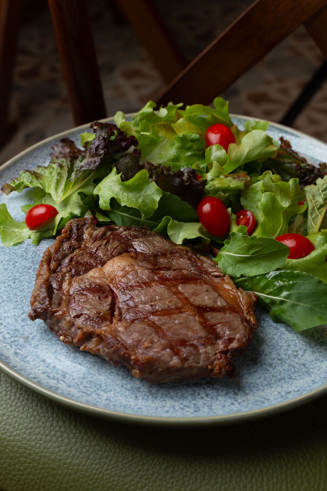 Suculento corte steack ancho ( 250g ) grelhado no carvão, salada ( mix de folhas, tomate cereja, mix de grãos, picles de cebola e molho de mostarda e mel com creme balsâmico.) Acompanha farofa de pão