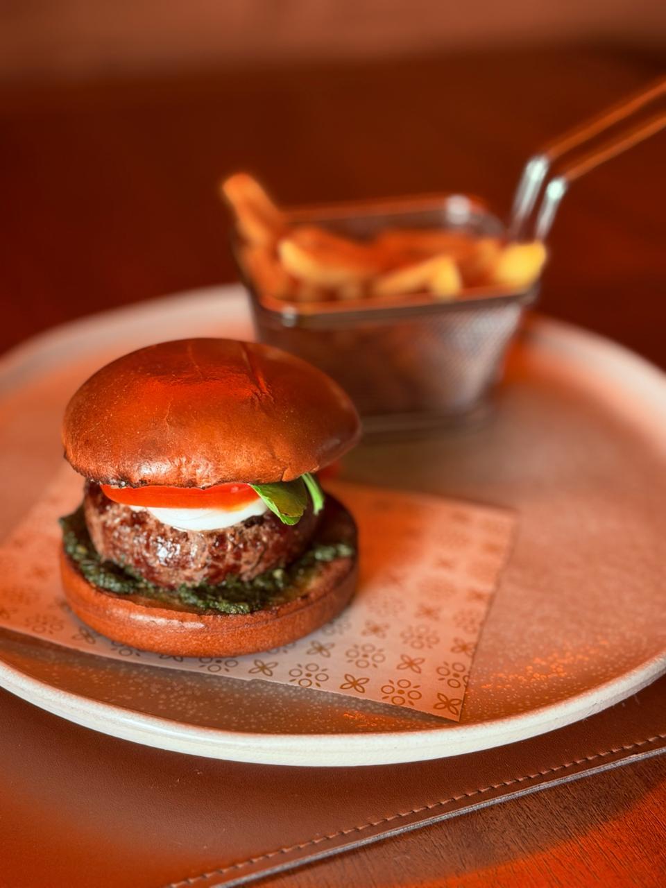 Pão brioche, blend de 160g de carnes defumada ao ponto, toque de mostarda dijon, pesto verde fresco, muçarela de bufala, tomate, rúcula, acompanha fritas.