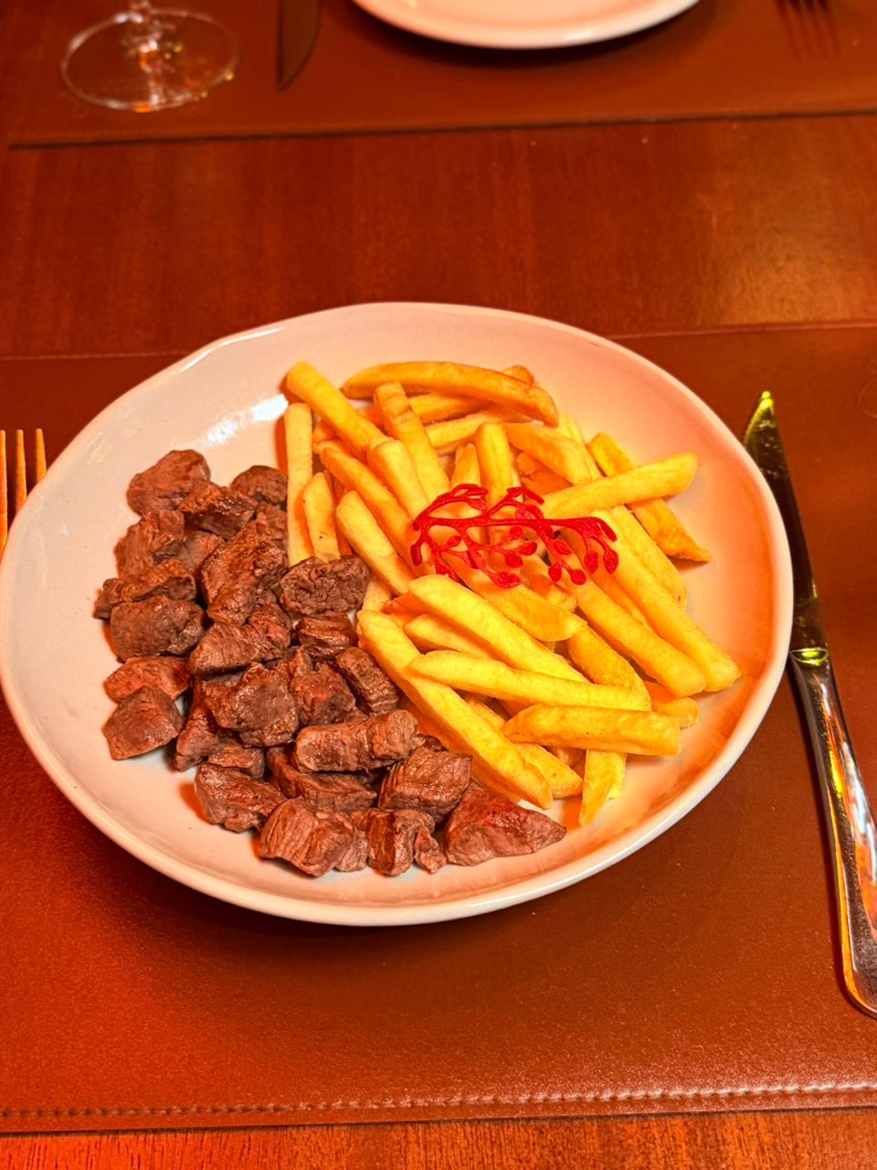 Um suculento bife de tiras de chorizo angus (400g), servido cortado no ponto da casa com molho de mostardas especial da chef, acompanha fritas.