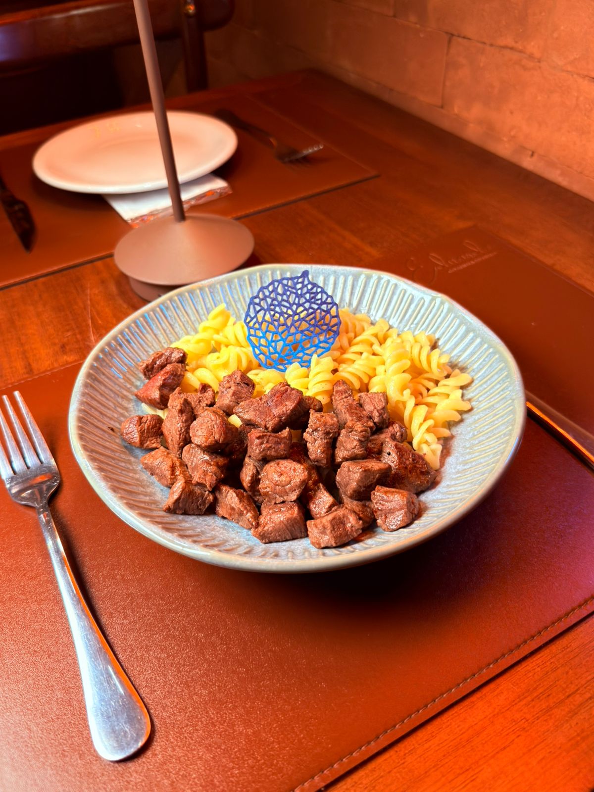 Massa pappardelle envolvido em creme de gorgozola suave, cubos de filé mignon e ervilhas frescas.