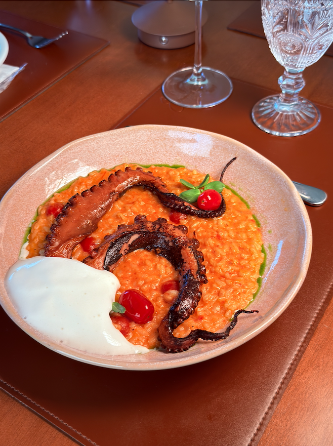 Risoto de camarão 7 barbas, polvo picado, tomate cereja, finalizado com tentáculo de polvo, molho Romesco e aioli de páprica picante.