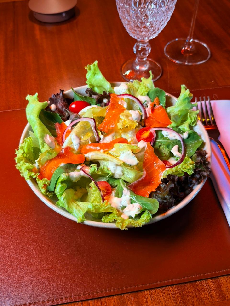 Mix de folhas, lâminas de salmão defumado na casa, tomatinhos frescos, mix de sementes tostados molho estilo ranch da chef (base de iogurte e maionese).