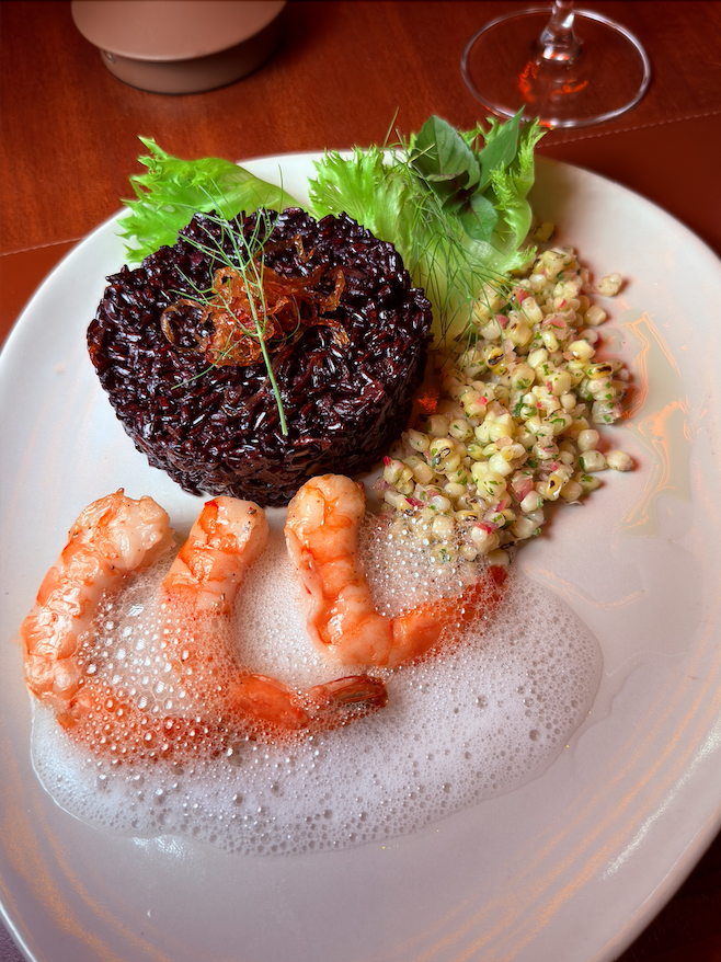 Uma deliciosa combinação morna de arroz negro com cebola caramelizada, vinagrete de milho tostado, 3 camarões grelhados, espuma citrica de limão.