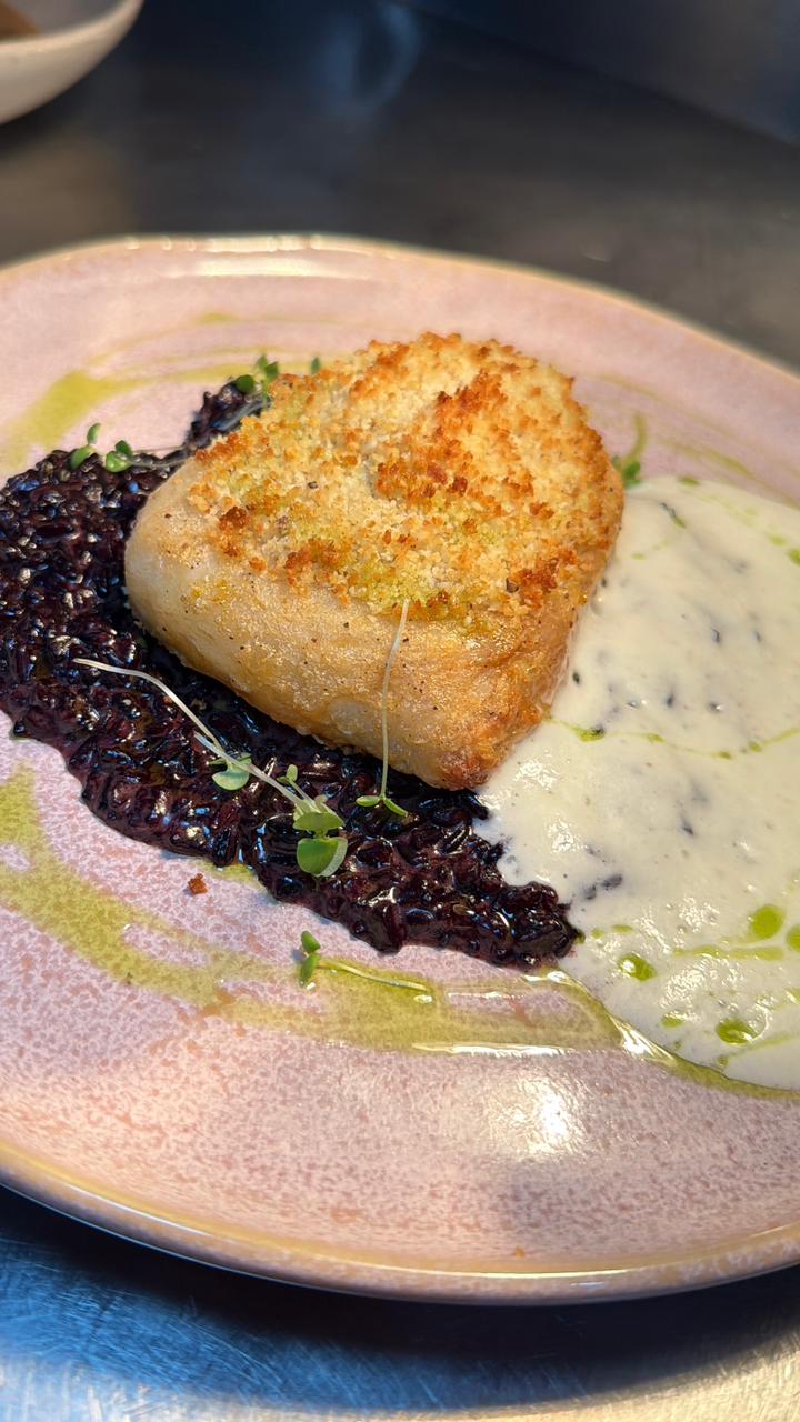Arroz negro cremoso, pirarucu com crosta crocante de castanha e espuma leve de limão siciliano.